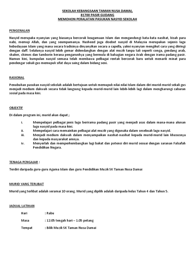Contoh Kertas Kerja Program Nasyid Written By Iseai61 Monday, February 21, 2022 Add Comment Edit Kertas Kerja Menganjurkan Pertandingan Nasyid Kertas Kerja Baju Nasyid Pdf Kertas Kerja Nasyid Pdf Kertas Kerja Pembelian Pakaian Kelab Nasyid Pdf Share this post